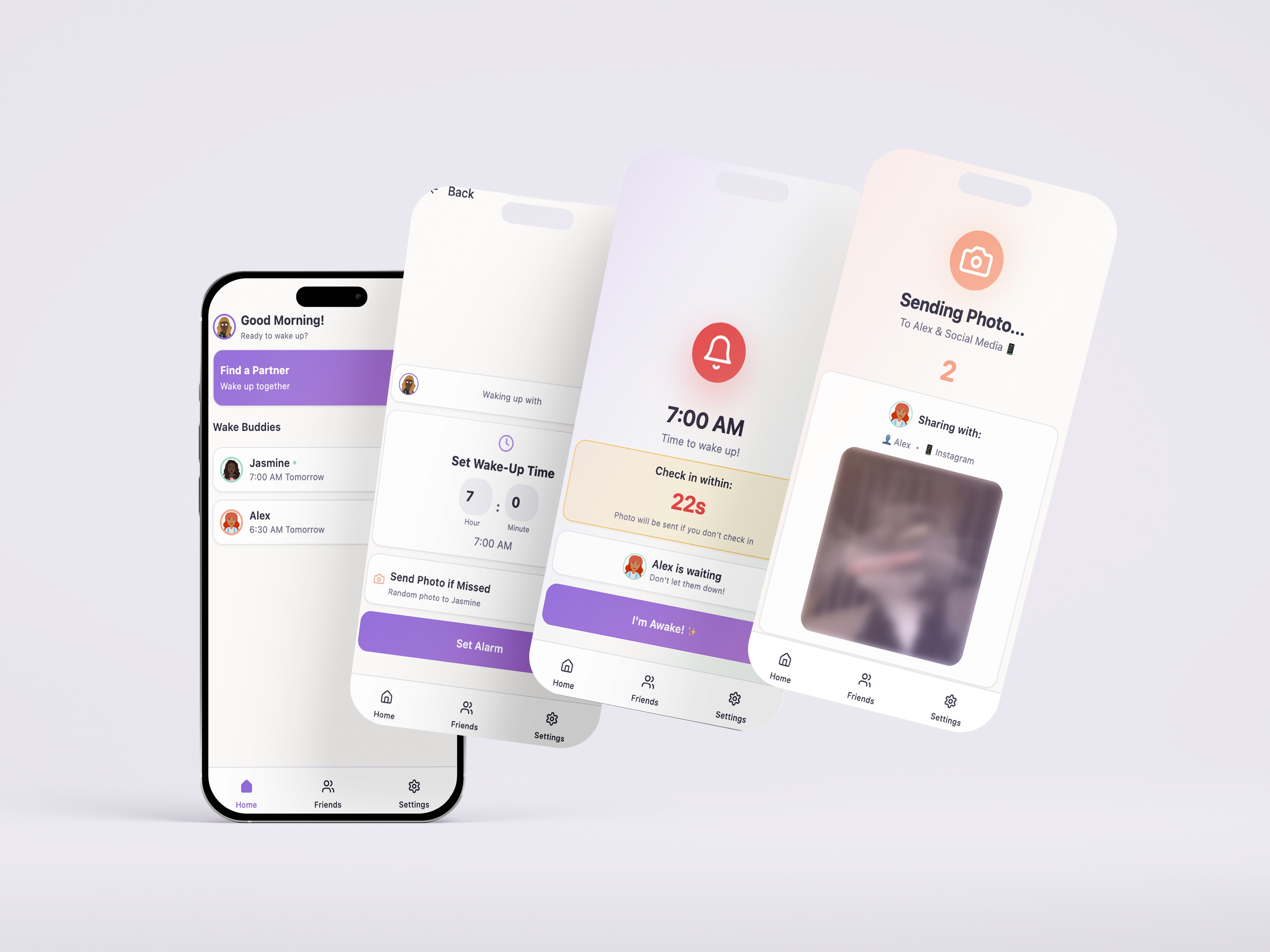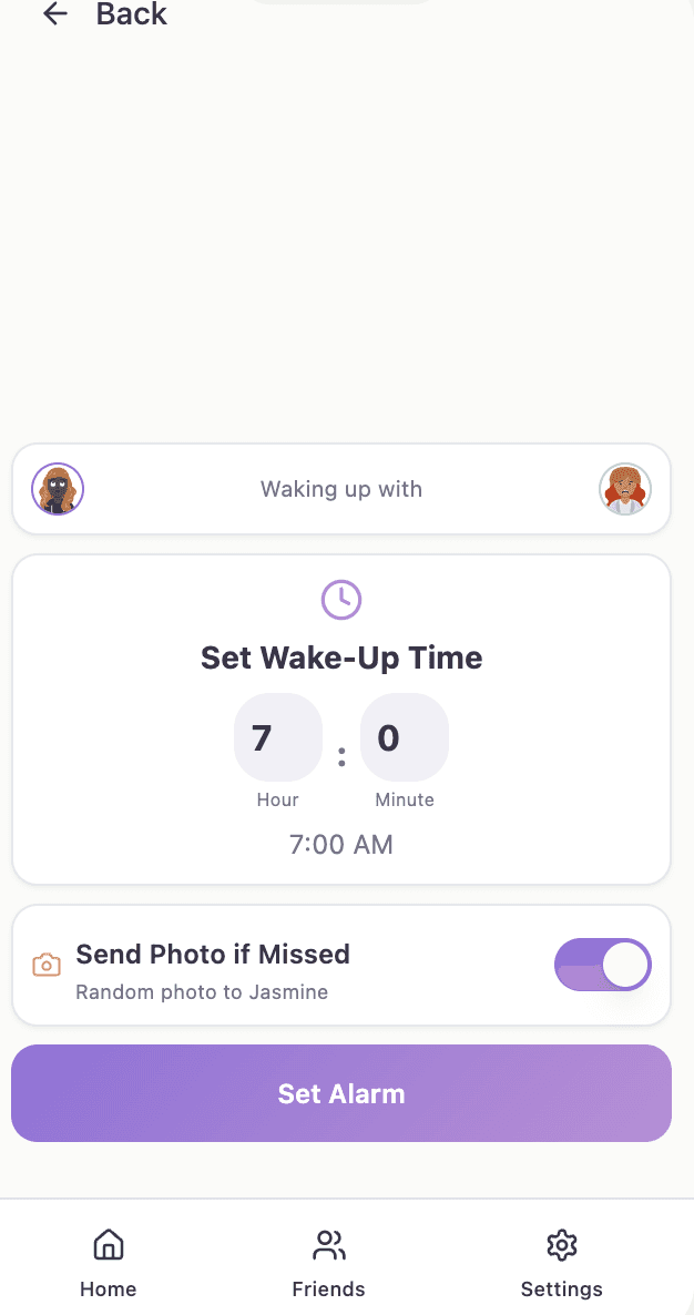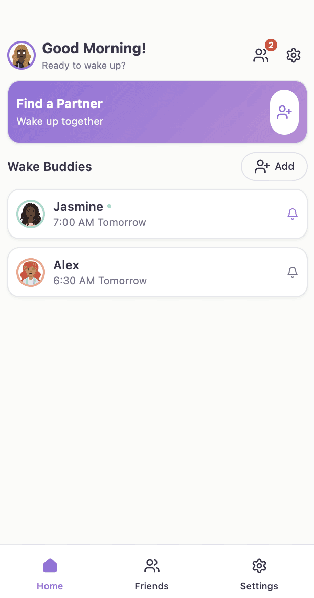 Pair with a wake-up partner, including family members or friends, to set an alarm together.
