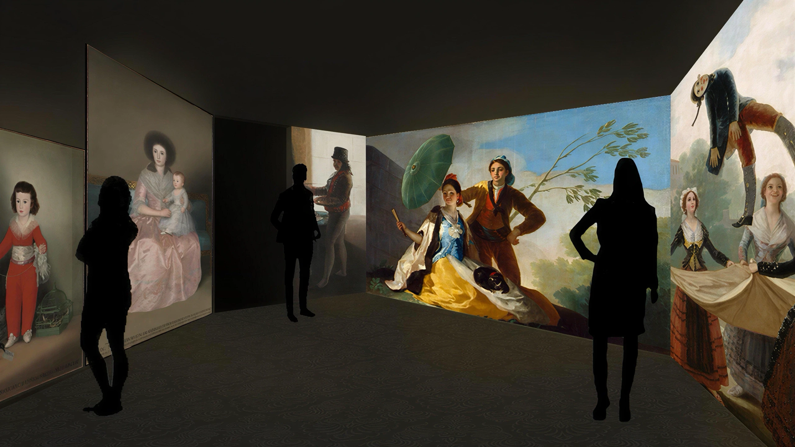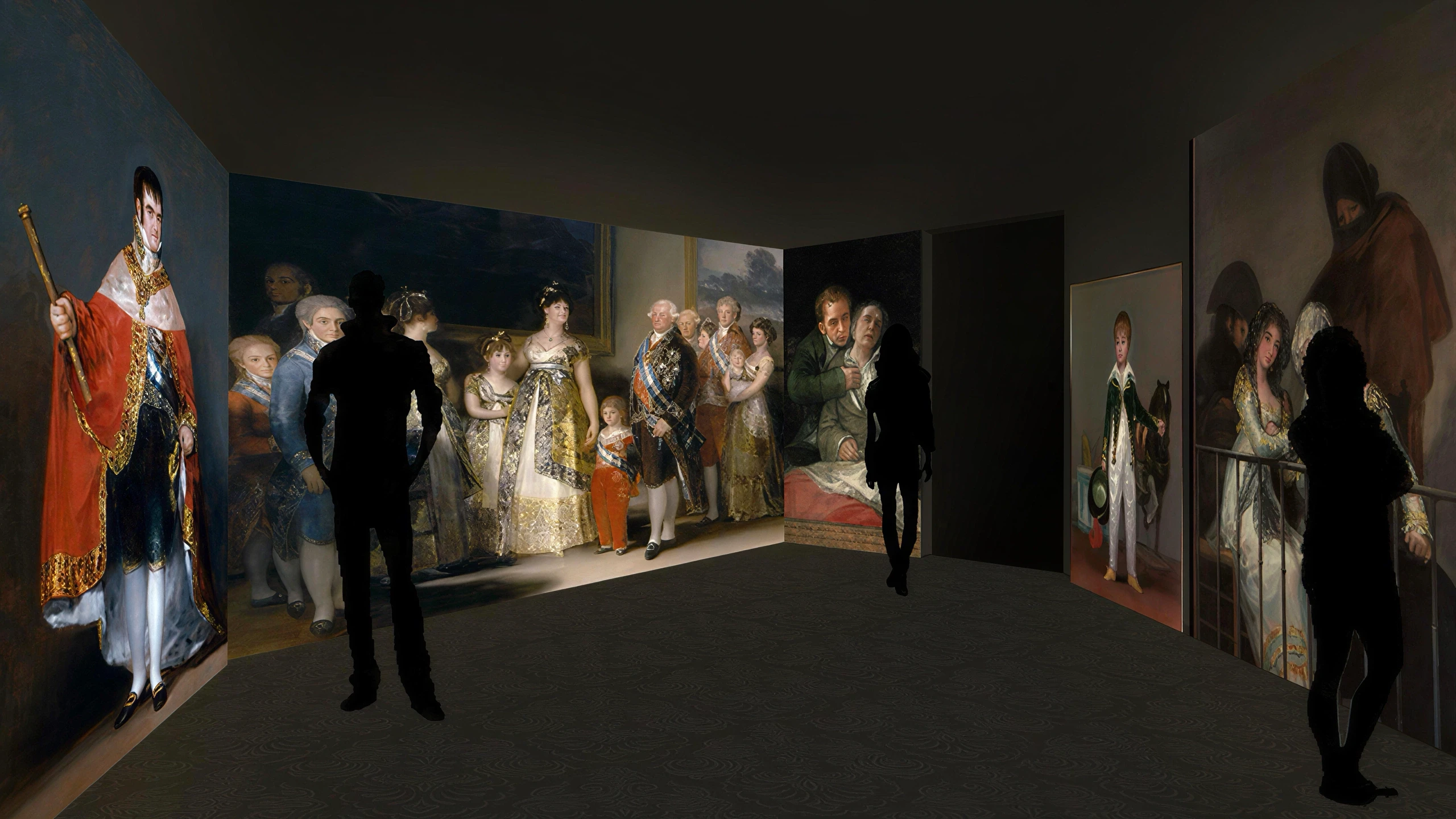 The immersive exhibition includes three main rooms and two hallways that guide visitors through Goya’s journey.